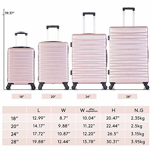 Are you still worried about tidying up your clothes before traveling? You can pack all your belongings and other necessities tightly in the 4 Piece Hard Shell Luggage Sets. The 4 piece luggage sets include one 18 inch suitcase, one 20 inch suitcase, one 24 inch suitcase and one 28 inch suitcase, which allows you to assign all your clothes in perfect order for your own needs and preferences. This luggage set is made of high-quality ABS material, which combines strength, elasticity and lightness. The firm coded lock guarantees the security of your luggage. No matter the multi-directional wheels, or the ergonomically designed telescoping handles will add much convenience to your trip. The spacious main compartment and zippered pockets keep your travel essentials, your small valuables well organized. It is perfect for any trip you may have.