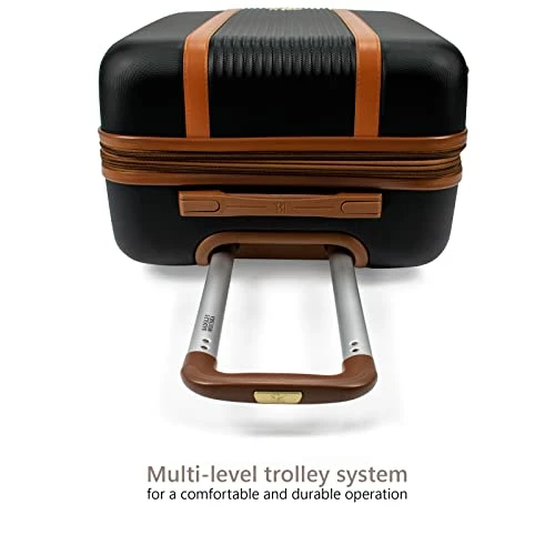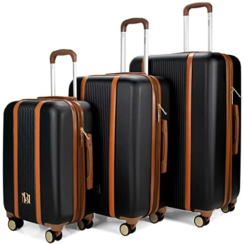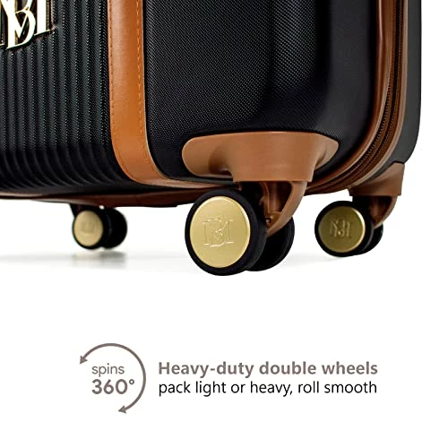 Luggage features: Made from thick ABS with a grainy texture Vintage silhouette with vegan leather and gold accents Eight spinner wheels that roll smooth, quiet, and handle heavyweights Expandable body with differentiated zipper pullers for hassle-free additional packing capacity Sturdy, telescopic, multi-level trolley 3-piece nested set 10-year limited manufacturer warranty
