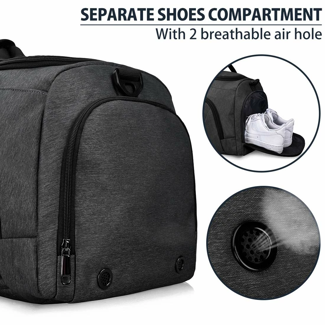 - ✔ SEPARATE SHOES COMPARTMENT – The shoes compartment of this sports duffle bag is designed with waterproof lining, stores your dirty sports shoes, sneakers separate from the main compartment. With two breathable air hole and exterior zipper, solve odor problems and save your time from rummaging. Length is up to 24 inches, most sizes of shoes can be fitted in.