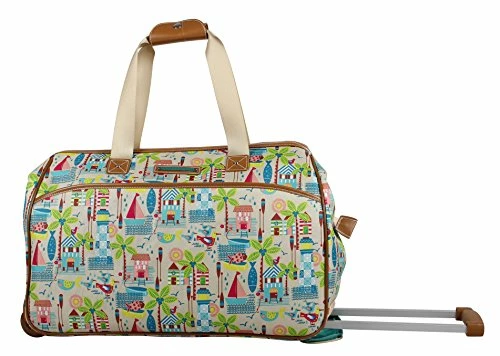 Lily Bloom, a handbag and accessories line focused on sustainable fashion, revels in vibrant colors and feminine prints. Each piece is made from a signature fabric created from recycled plastic bottles. This wheeled duffel use reinforced handle poles for extra strength and durability. The construction of the bag is designed to maximize space and leave extra room for packing when you need it. This is a beautiful piece of traveling art piece specially designed for the environmentally conscious modern lady!