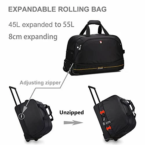 - *22 INCH ROLLING DUFFLE BAG WITH WHEELS: Size-21.8×10.2×14.2 inch (55.5×26.5×36 CM) with 45 Liters capacity; Open the bottom of the bag and release the height of 8cm, which expands the capacity to 55L. Weight: 4.6 lb.
