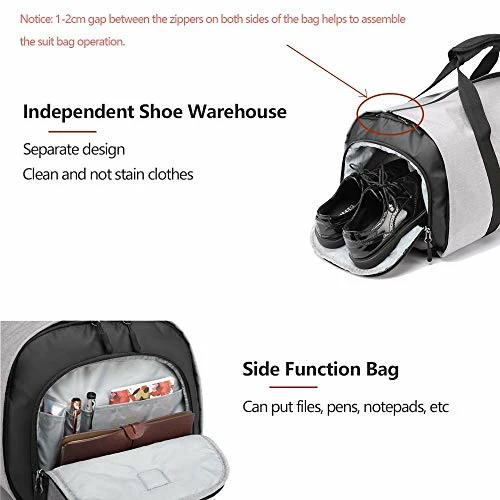 - ✔ Separate Shoes Compartment & Wet Pocket: The separate shoes compartment is designed with a air hole to keep sport duffle bag clean and ventilated. The wet pocket with waterproof material can store your sweaty clothes to keep your main compartment dry. The bag is able to use as a Gym bag, Overnight bag, Weekend bag, Travel duffel bag and so on.