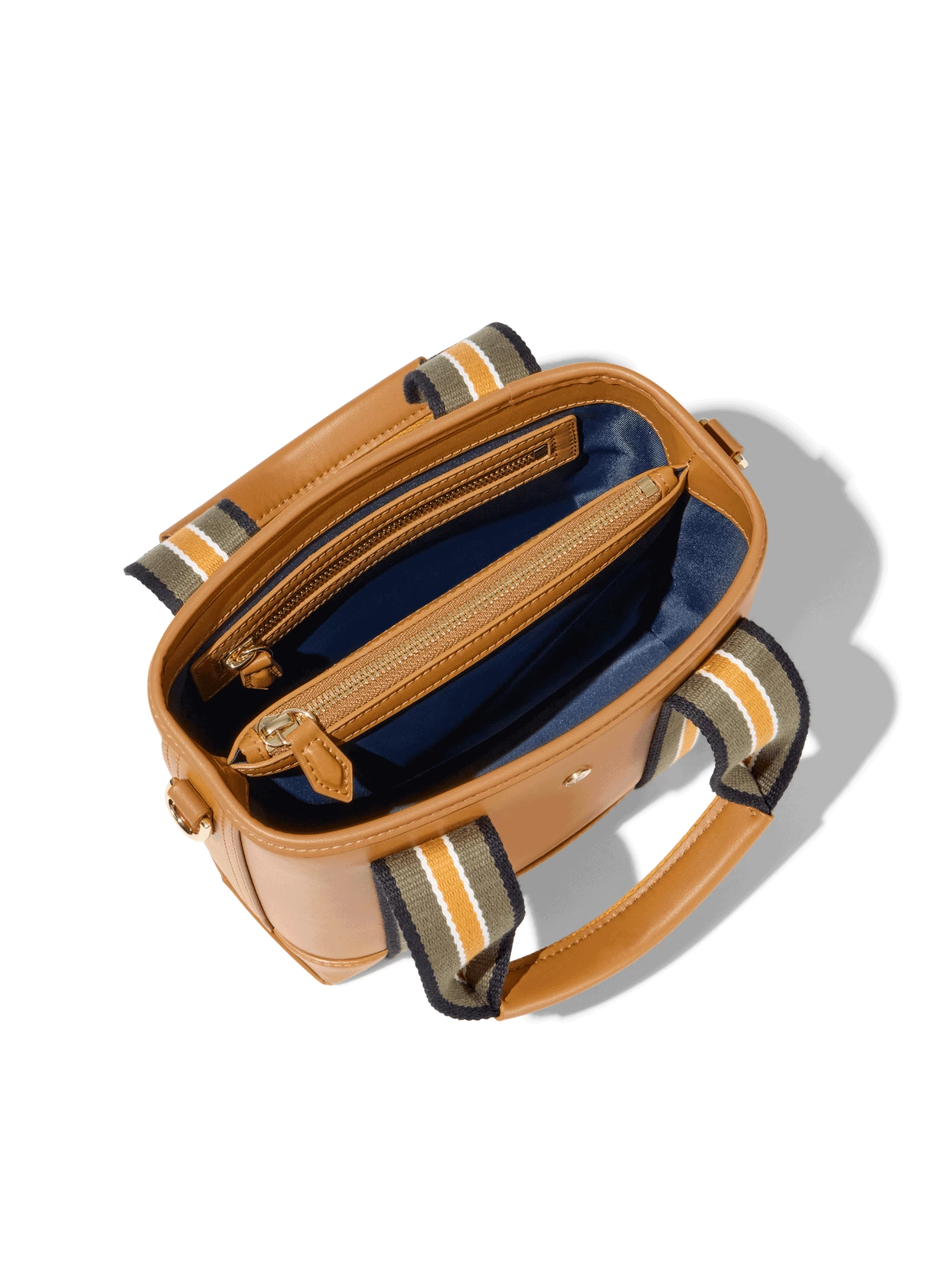 The playful handbag-sized Mini Cabana Tote mixes premium recycled vegan leather with signature sporty stripes. An adjustable, detachable strap provides the option to wear cross-body or over the shoulder. An interior zip pocket and center zip compartment secures daily essentials including sunglasses, wallet, lipstick, and phone.