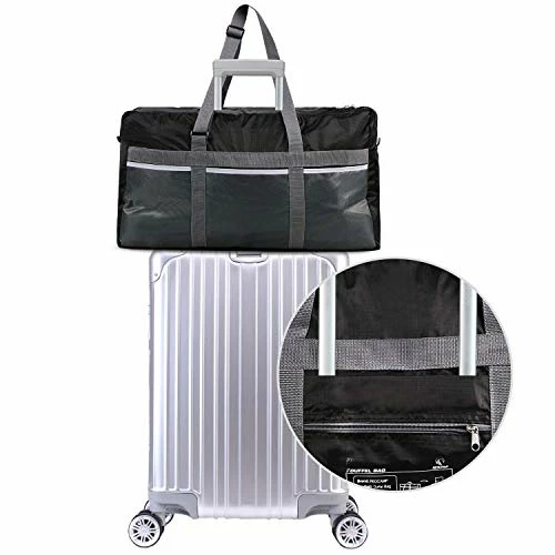 - POCKETS: The REDCAMP extra large duffel bag is equipped with four outside pockets with 3 open mesh pockets on one side and a zippered pocket on the other side. It also has an interior pocket that the duffel bag folds into when not in use. There is also a special suitcase sleeve to conveniently carry the bag on top of your rolling suitcase