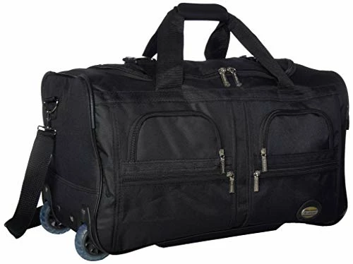 Details: Travel in style with this great soft-sided rolling duffle bag. Bag features a heavy duty polyester construction. Inline skate wheels for superior mobility, internal retractable hide-away handle system, u-top opening provides easy access to roomy zipper secured main compartment. Two front zipper-secured compartments, adjustable ergonomic shoulder strap. Made of 600 denier heavy duty polyester. Measures 22″ L x 12″ W x 11″ H
