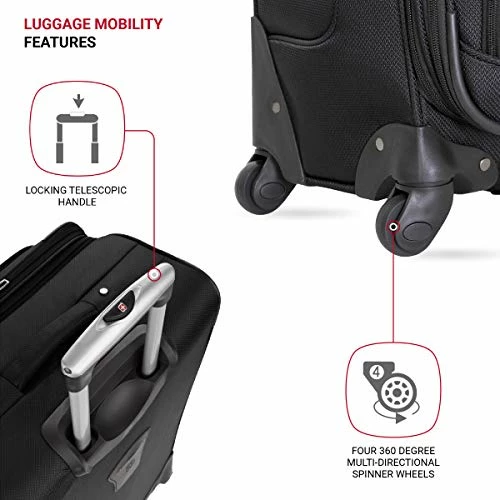 Details: The SwissGear Sion Expandable Spinner Luggage Collection features a locking push/pull handle system and four 360-degree spinner wheels for superior mobility. Made of durable, scuff-resistant polyester fabric, its interior is fully lined and features adjustable luggage tie-down straps, a removable zippered wet bag, a large mesh lid pocket, and a packing pocket for holding small items and accessories. Other features include two front panel pockets, a built-in ID tag, and a padded top grab handle.