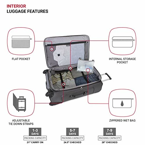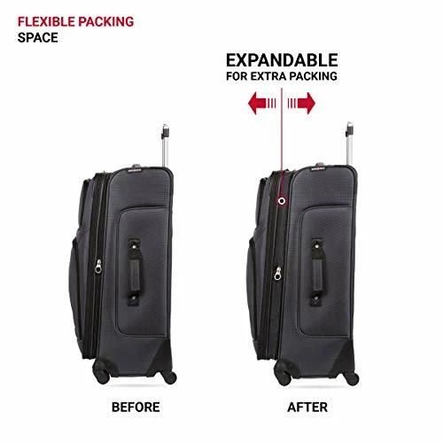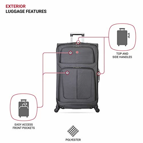 Details: The SwissGear Sion Expandable Spinner Luggage Collection features a locking push/pull handle system and four 360-degree spinner wheels for superior mobility. Made of durable, scuff-resistant polyester fabric, its interior is fully lined and features adjustable luggage tie-down straps, a removable zippered wet bag, a large mesh lid pocket, and a packing pocket for holding small items and accessories. Other features include two front panel pockets, a built-in ID tag, and a padded top grab handle.