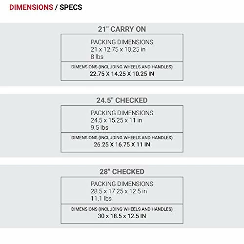 - SET INCLUDES: 21” Carry On Spinner (Dimensions: 22.75” x 14.25” x 10.25”, Weight: 8 lbs.); 25” Checked Spinner (Dimensions: 26.25” x 16.75” x 11”, Weight: 9.5 lbs.); 29” Checked Spinner (Dimensions: 30” x 18.5” x 12.5”, Weight: 11.1 lbs.;)