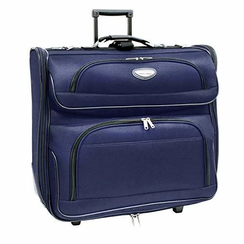 Details: The travel select Amsterdam business rolling garment bag is ideal for keeping your clothes crisp and clean while you are traveling. This garment bag is made of industrial quality hardware; 1200d two-tone polyester construction with an EVA reinforced front panel. It features an internal handle system, inline skate wheels, and an adjustable and detachable shoulder strap with a non-slip pad. It has a spacious main compartment with zippered mesh pockets and multiple outside gusseted pockets for easy packing. The convenient tie straps secure items while the fold-out design helps to reduce wrinkles in suits. Plus, the top carry handle is designed for easy lifting and center strap is built in for carrying extra bag. Size: 23″w x 22″h (44″ opened) x 7″d 9.3 Lbs.