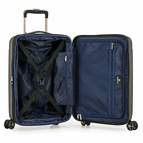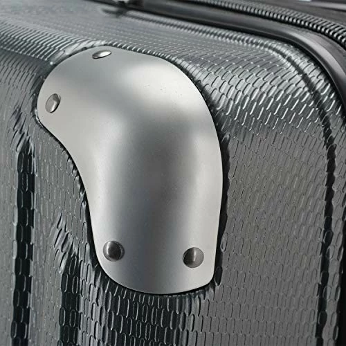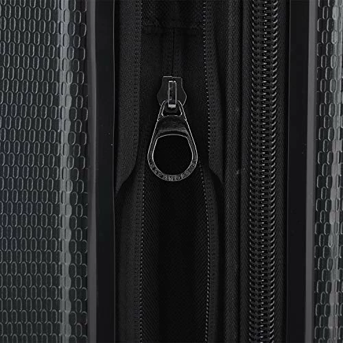 Details: Durable hard-shell construction with riveted corner guards offer great protection. Textured finish prevents abrasive scratches and finger prints. Aluminum telescopic handle system with push-button mechanism provides easy maneuverability. 360-Degree spinner wheel system provides wide wheel base for better traction and stability. 10 Main zipper makes opening and closing a breeze. 2-Inch expansion gusset allows 25 percentage more packing capacity. Main compartment features a claim-shell opening. Interior includes cross-tie straps, zippered divider, and pockets for extra storage. 22” carry-on spinner overall Dimension: 21.5”H x 14”w x 9.5”D + 2” expansion packing capacity: 20”h x 14”w x 9”d + 2” expansion linear inches: 45 weight approx. 7.47 lbs.