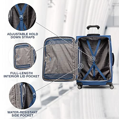 Details: Take this 3- piece spinner set for a spin. The Travelpro®AutoPilot™ 2.0 3-Piece Expandable Spinner Set” Expandable lets you pack for a week or more with a tapered expansion option that gives you up to 2” more packing capacity in a tip-resistant design. Plus, the interior lid pocket, water-resistant side pocket and adjustable hold down straps keep everything organized and in its place. A honeycomb frame system provides durability without extra weight, while the unique bottom tray construction helps align and stabilize the eight 360° spinner wheels–for effortless maneuverability and enhanced toughness. A telescoping extension handle adjusts to users of different heights and features an ergonomic, Patented Contour Grip for a great handhold and easy steering. Treated to resist moisture and stains inside and out, this bag is built to last and backed by our Limited Lifetime Warranty