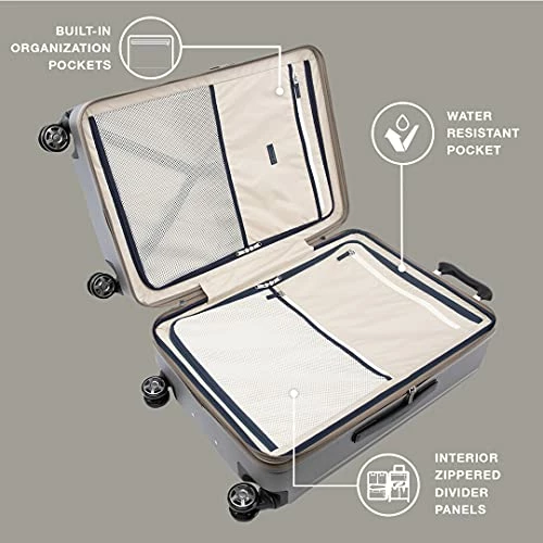 Details: Upgrade your travel experience with the stylish, ultra-durable Platinum® Elite Hardside Spinner Set. This sleek spinner set includes a carry-on designed to to fit in the overhead compartment on most U.S. airlines and a check-in ideal for medium and longer trips that complies with published check-in size restrictions for nearly all major domestic airlines. With great looks and ultra-durability with effortless mobility this innovative set is packed with modern conveniences.The carry-on lets you power your electronics on the go using external USB A & C ports with fast-charge capabilities and a dedicated external-access battery pocket (patent pending) that provides FAA-compliant storage for your power bank. Wherever you go, this spinner set flies with precise control and effortless roll, thanks to the Travelpro® exclusive PrecisionGlide™ System–eight MagnaTrac® self-aligning spinner wheels led by a sturdy, four-stop adjustable PowerScope Lite handle with comfortable Contour Grip. Designed for great looks and ultimate resilience, this set is constructed with an ultra-strong 100% polycarbonate shell that flexes upon impact to prevent cracking and keep contents protected, while its attractive textured finish helps reduce the visibility of scuffs or scratching. Genuine leather trim adds a sophisticated touch, and distinctive aluminum corner armor protects high-impact areas in style. A built-in lock allows TSA authorities to unlock and lock safely and securely when needed. The zippered 2″ expansion option gives you increased packing capacity when needed. Interior zippered divider panels and adjustable hold-down straps keep contents organized, separated and secured. Multiple accessory pockets provide built-in organization, and a water-resistant pocket provides a convenient place to stow away damp items or toiletries.